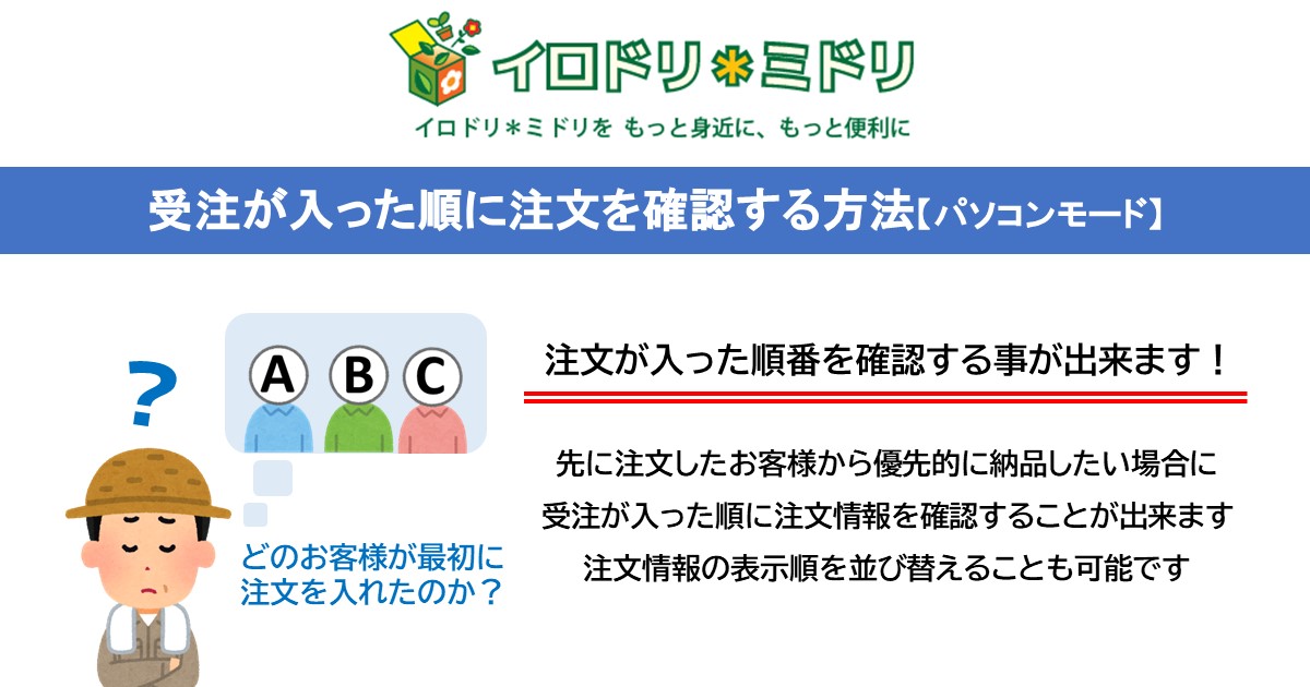 . イロドリ*ミドリで提案した商品に注文が入った場合に、どのお客様が一番最初に注文を入れたのか、 受…