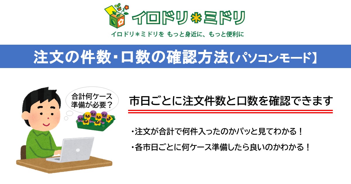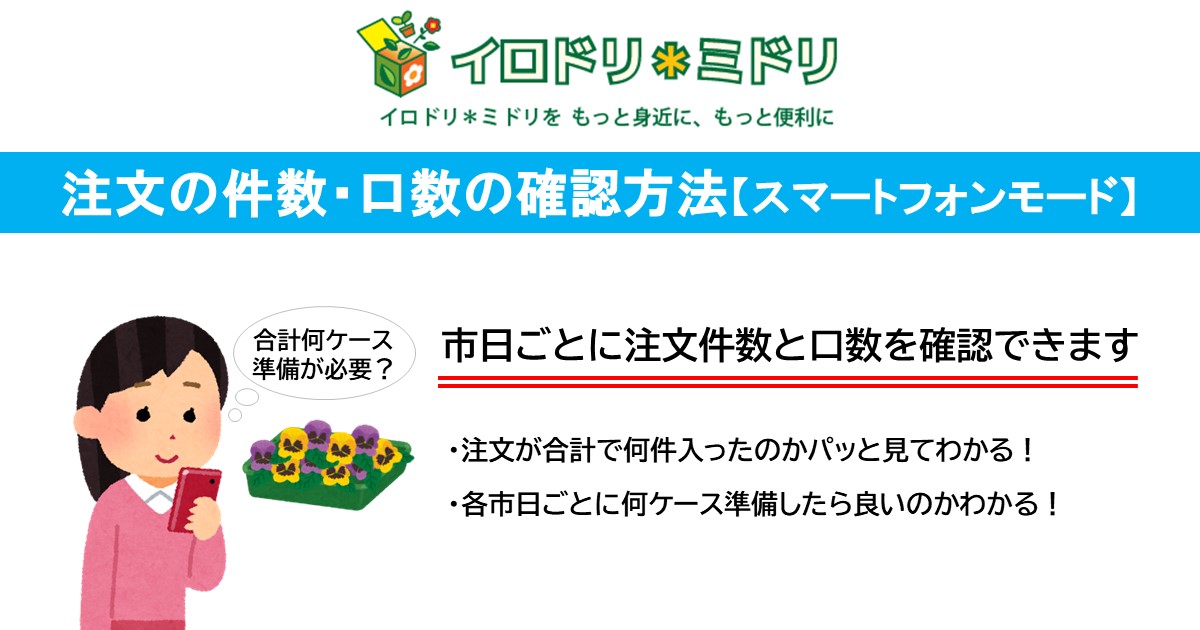 . イロドリ*ミドリの「予約注文確認」で注文の合計件数・口数を市日ごとに確認することが出来ます! 各…