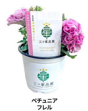 【三ッ星品質】ペチュニア ‘フレル’ 2025.04.02 2025年1月、第1弾を発売した「三ッ星品質」。第2弾 ペチュニア「フレル」のご紹介です。 私たちは、作り手の想いと消費者の期待に応えたい一心で このプロジェクトを立ち上げました。 作り手はもちろんのこと、消費者の視点を取り入れたのが“三ッ星品質”です。 これまでの園芸のアプローチ方法とは異なる、 「販売までに一定数の消費者のテストを経て改善する」という新たなプロセスを経て、 安心できる商品を皆さまにお届けいたします。 詳しくはこちら(三ッ星品質 公式Webページ) 売場展開例 お取扱いに関するお問合せはこちら