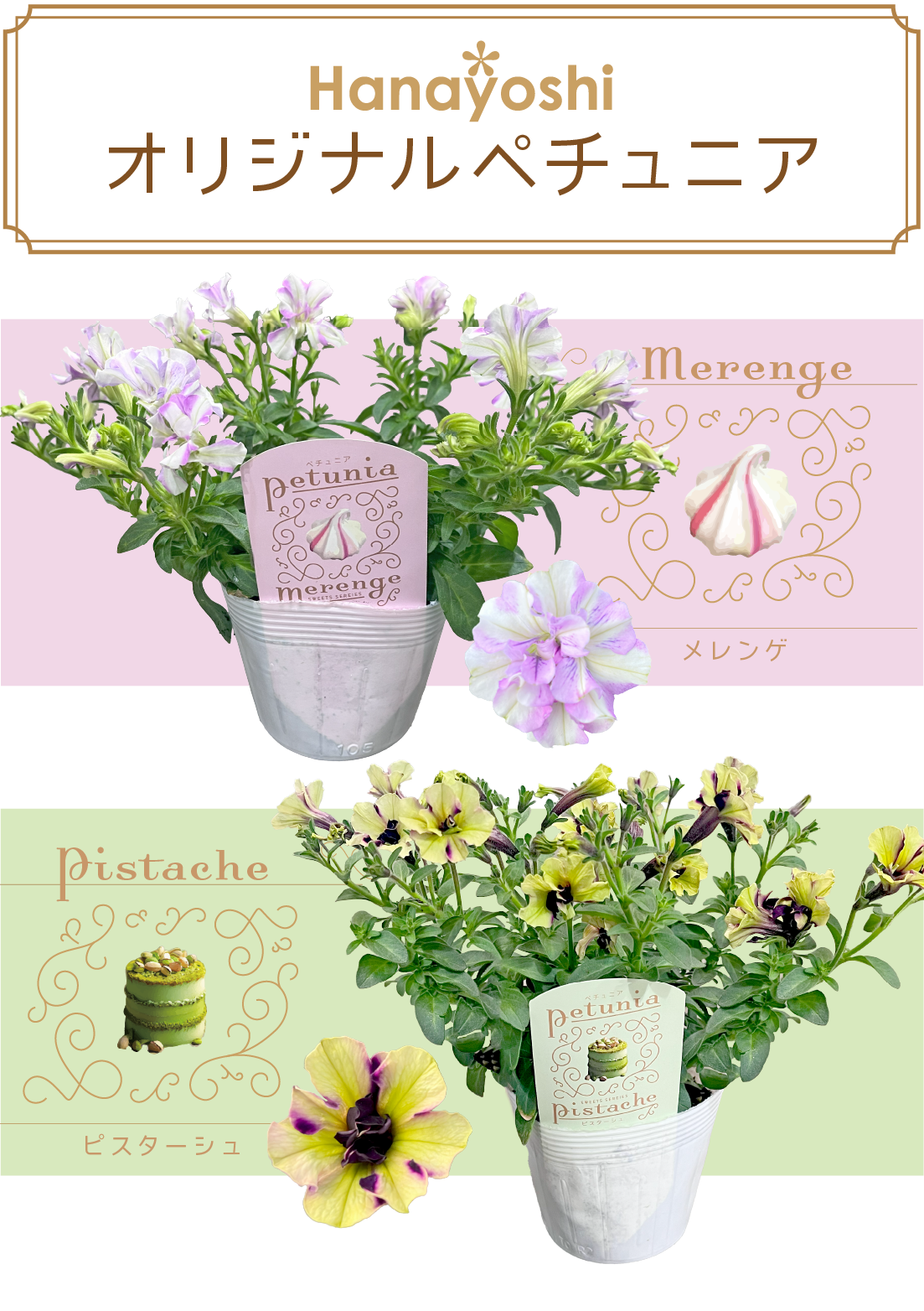 Hanayoshi オリジナルペチュニア2種 2025.04.25 Hanayoshiオリジナルペチュニア2種を豊明花き限定で販売。 どちらもスイーツにちなんで、メレンゲ・ピスターシュと名付けました。 オリジナルラベル付き お取扱いに関するお問合せはこちら