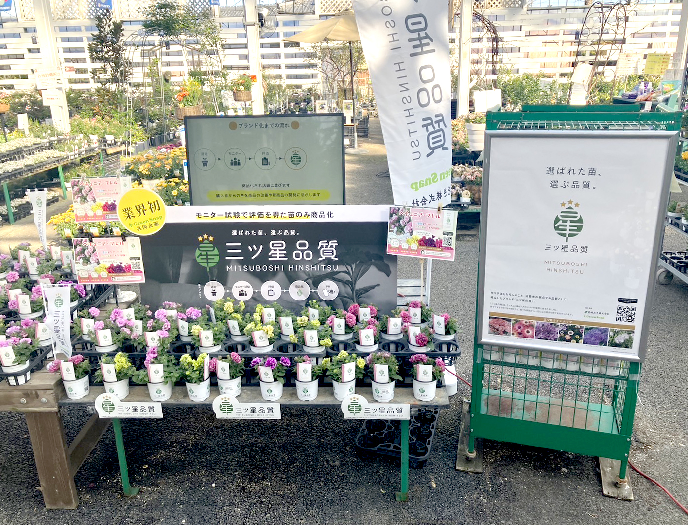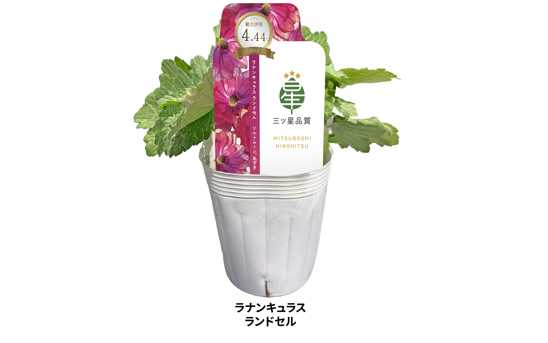 【三ッ星品質】ラナンキュラス ‘ランドセル’シリーズ 2025.11.30 2025年1月に発売した「三ッ星品質」。 秋冬から春まで楽しめる「ラナンキュラス ‘ランドセル’」のご紹介 です。 私たちは、作り手の想いと消費者の期待に応えたい一心で このプロジェクトを立ち上げました。 作り手はもちろんのこと、消費者の視点を取り入れたのが“三ッ星品質”です。 これまでの園芸のアプローチ方法とは異なる、 「販売までに一定数の消費者のテストを経て改善する」という新たなプロセスを経て、 安心できる商品を皆さまにお届けいたします。 詳しくはこちら(三ッ星品質 公式Webページ) 売場展開例 お取扱いに関するお問合せはこちら