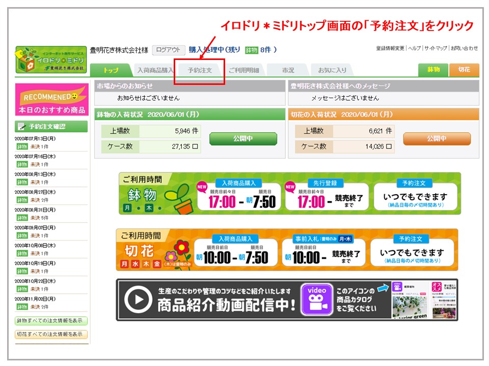 ①イロドリ*ミドリのトップページにある「予約注文」をクリックしてください。