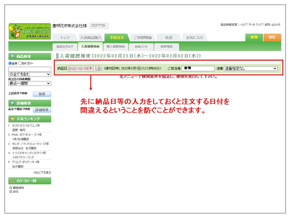 ③納品日・ご担当者名の入力をして下さい。枝番が必要な場合は選択して下さい。