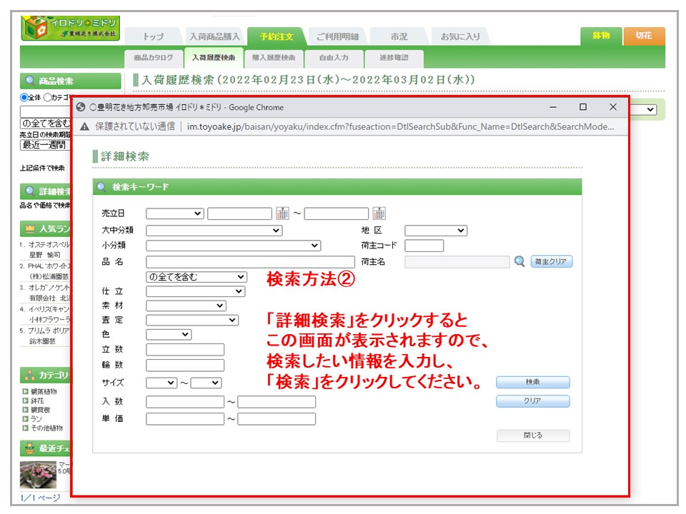 市日・品名・サイズ等、細かい情報の検索もできます。