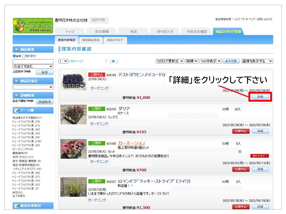 ①イロドリ*ミドリトップページの「商品カタログ登録」をクリックし、「提案内容確認」を開いてください。