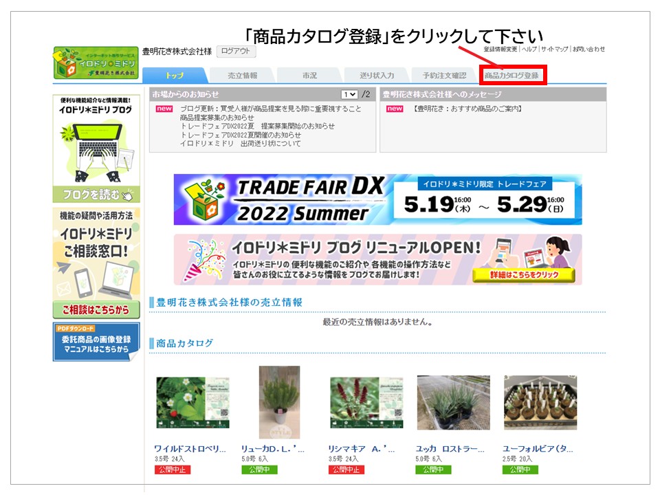 ①イロドリ*ミドリトップページの「商品カタログ登録」をクリックして下さい。