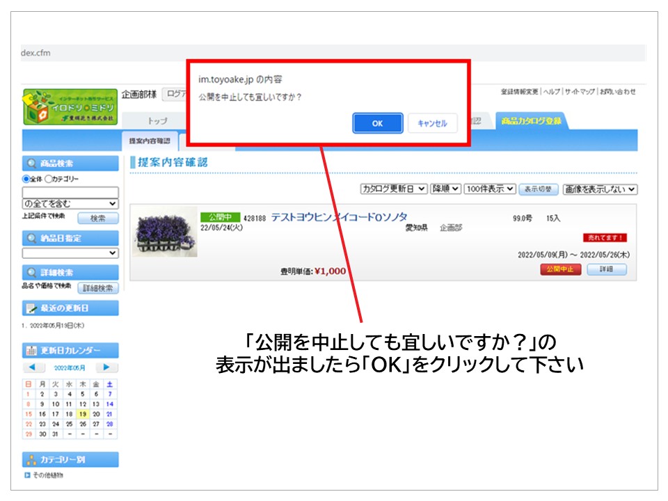 ③「公開を中止しても宜しいですか?」の表示が出ましたら「OK」をクリックして下さい。
