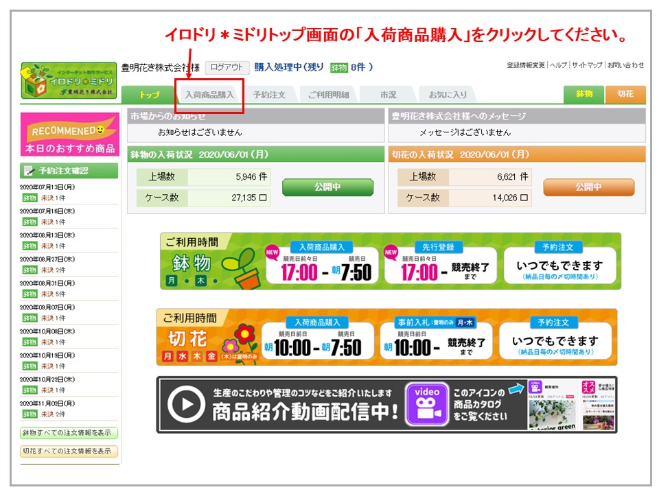 イロドリ*ミドリトップ画面の「入荷商品購入」をクリックしてください。