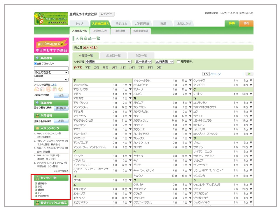 入荷商品購入の左下に「カテゴリー別」検索機能があります。