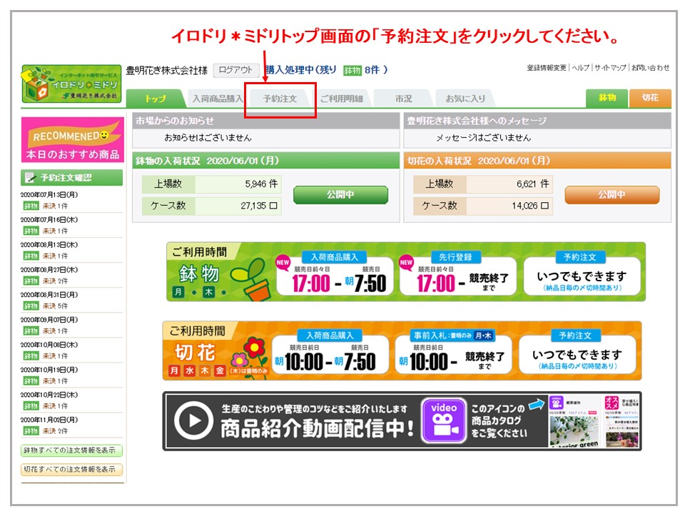イロドリ*ミドリトップ画面の「予約注文」をクリックしてください。