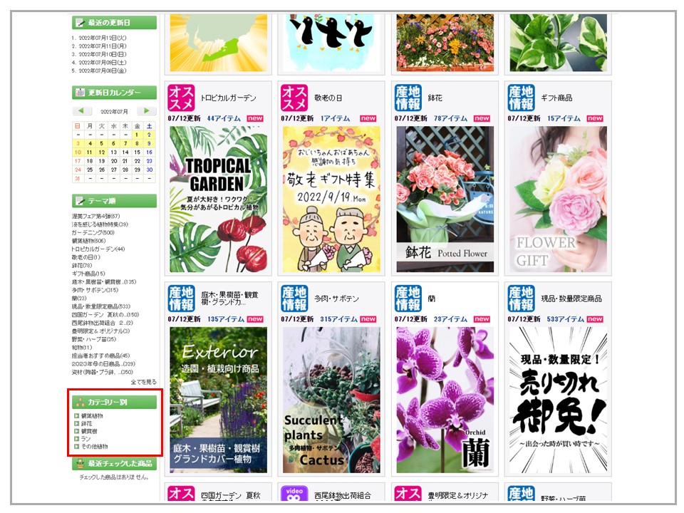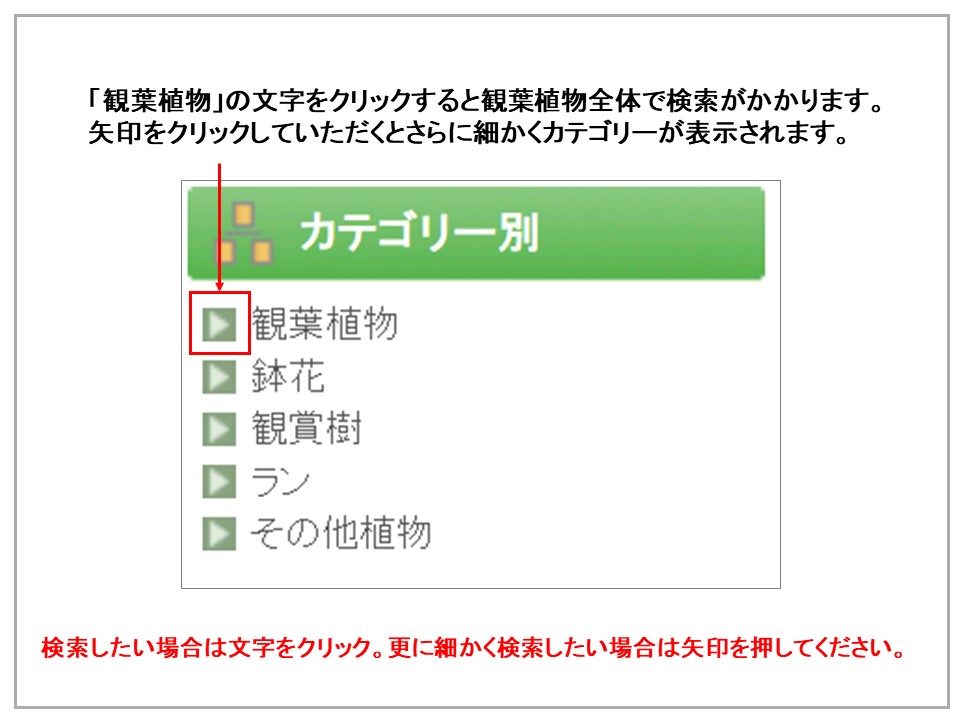 カテゴリー別検索は文字(観葉植物など)をクリックすると選択したカテゴリーの検索がかかり、
