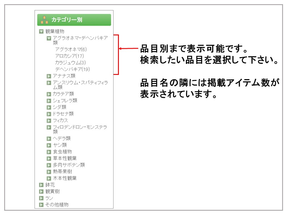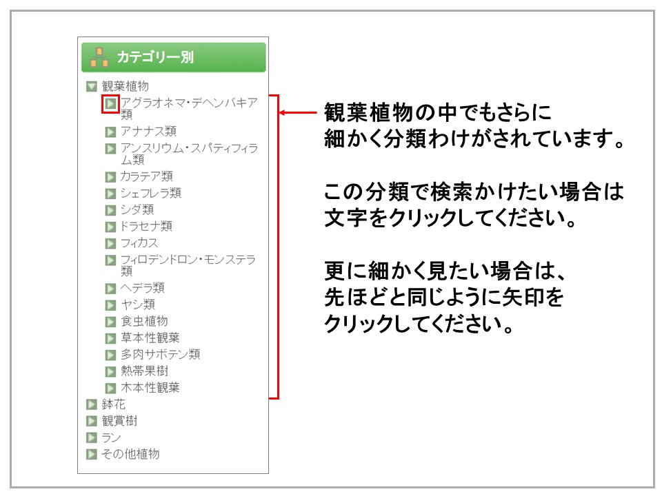 イロドリ*ミドリ入荷商品購入・予約注文機能にあるカテゴリー別検索機能を多くの方がご利用していただいていると思います。カテゴリー別検索は文字(観葉植物など)を選択すると検索がかかり、矢印をクリックするとさらに細かく分類が表示されるようになっています。今回はその検索方法についてご紹介いたします。今までうまく検索できなかったという方はぜひご覧ください。