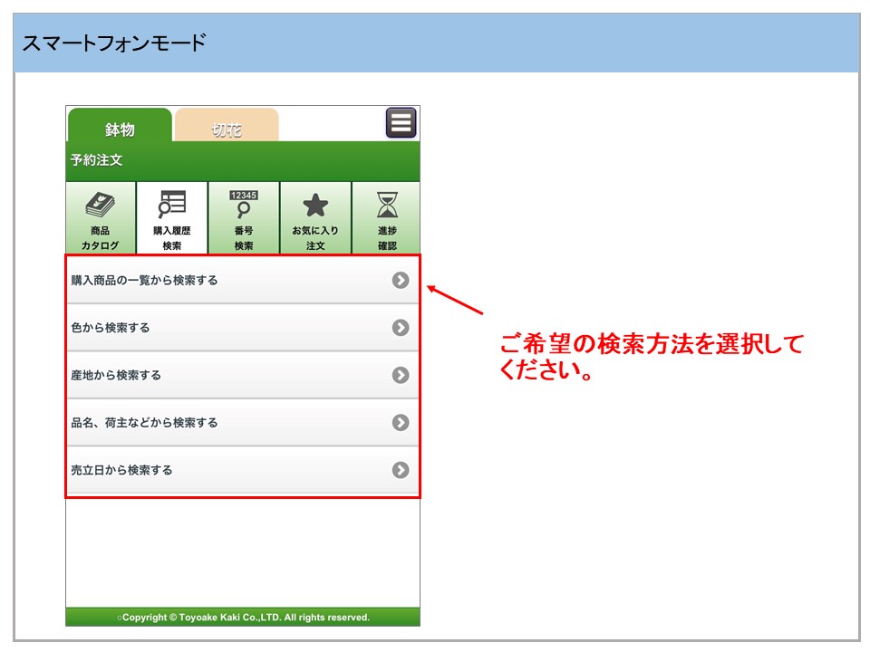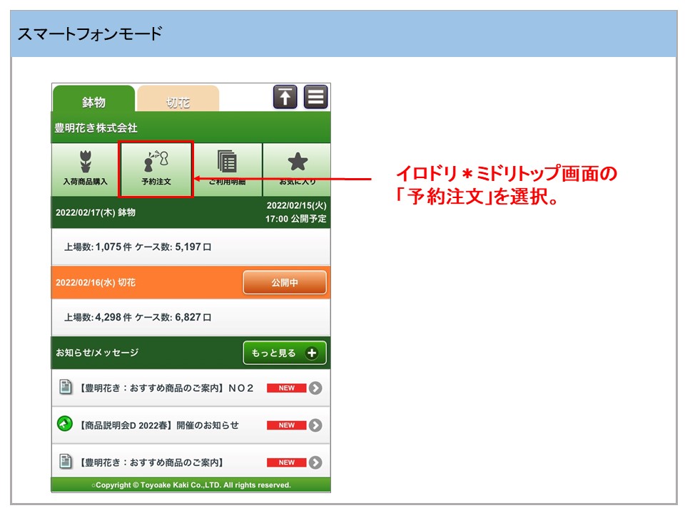 ①イロドリ*ミドリトップ画面の「予約注文」を選択します。