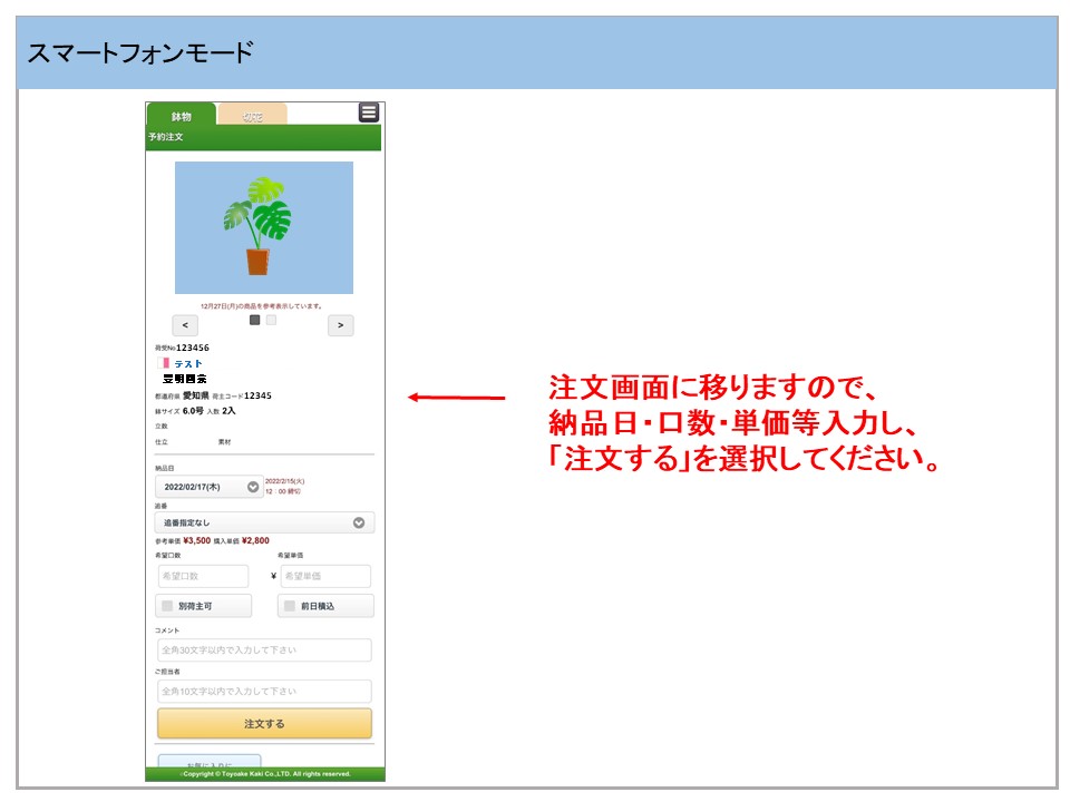 納品日の選択・口数・単価等入力・ご担当者名の入力等を行ってください。