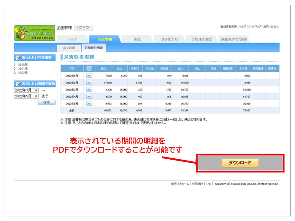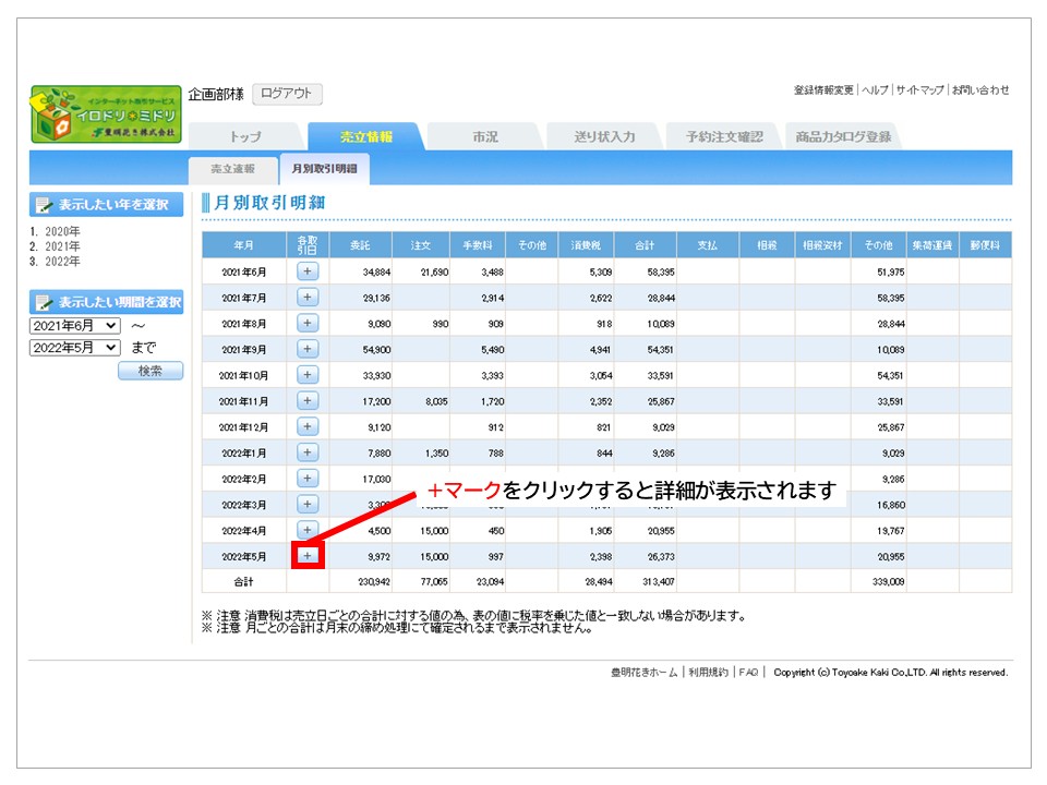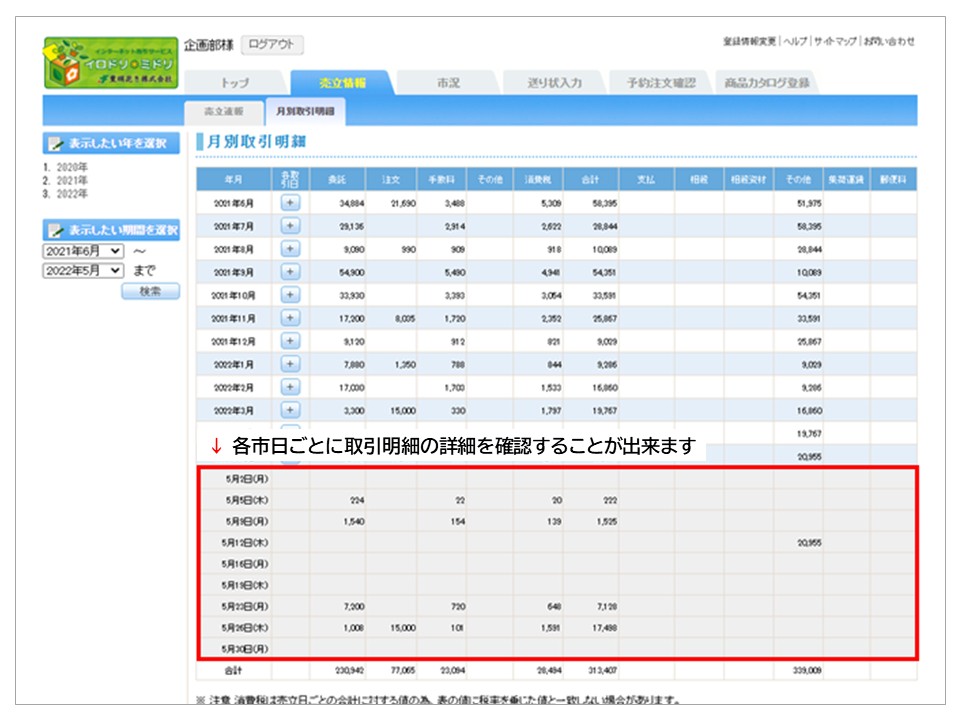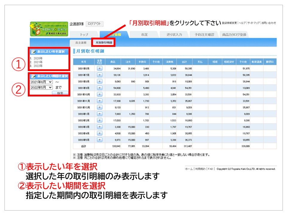 イロドリ*ミドリでは月別で取引明細の確認をすることが可能です。