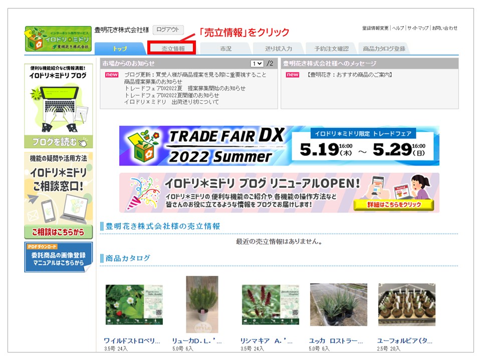 ①イロドリ*ミドリトップページの「売立情報」をクリックして下さい。