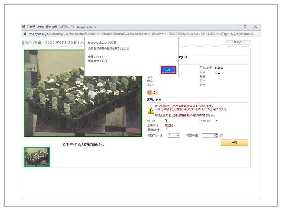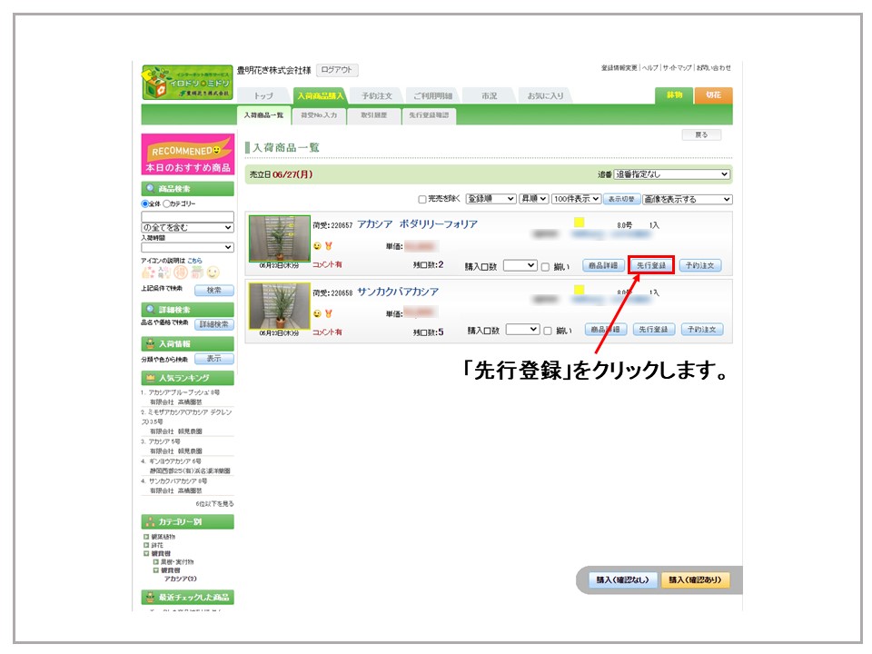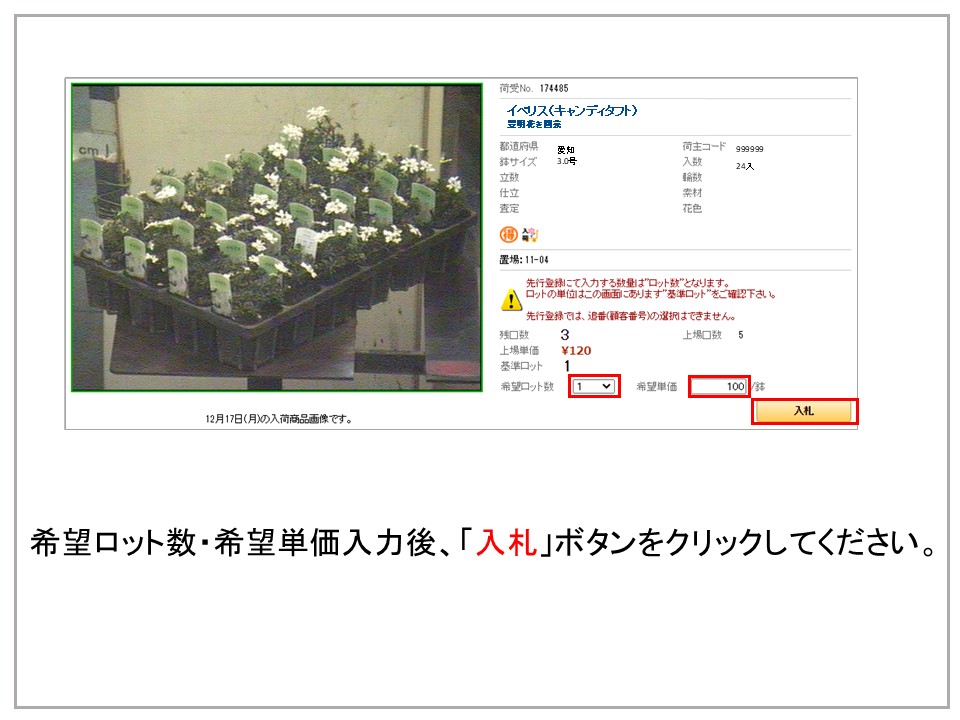 イロドリ*ミドリでは、購入したい商品が競売で販売される前に、お客様の希望単価を登録し、入札を行うことが可能です。これを「先行登録」と言います。入札したい商品が競売で販売されるまで、自由に希望単価を変更することが可能です。落札できたかどうかもネット上でご確認いただけます。今回はこの便利な機能をご紹介いたしますので、ぜひご覧ください。