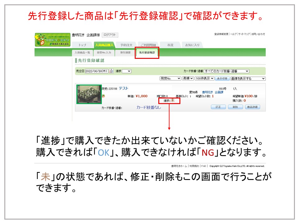 先行登録した商品を確認したい場合、入荷商品購入「先行登録確認」をクリックしてください。 訂正や削除もこの画面から行うことができます。