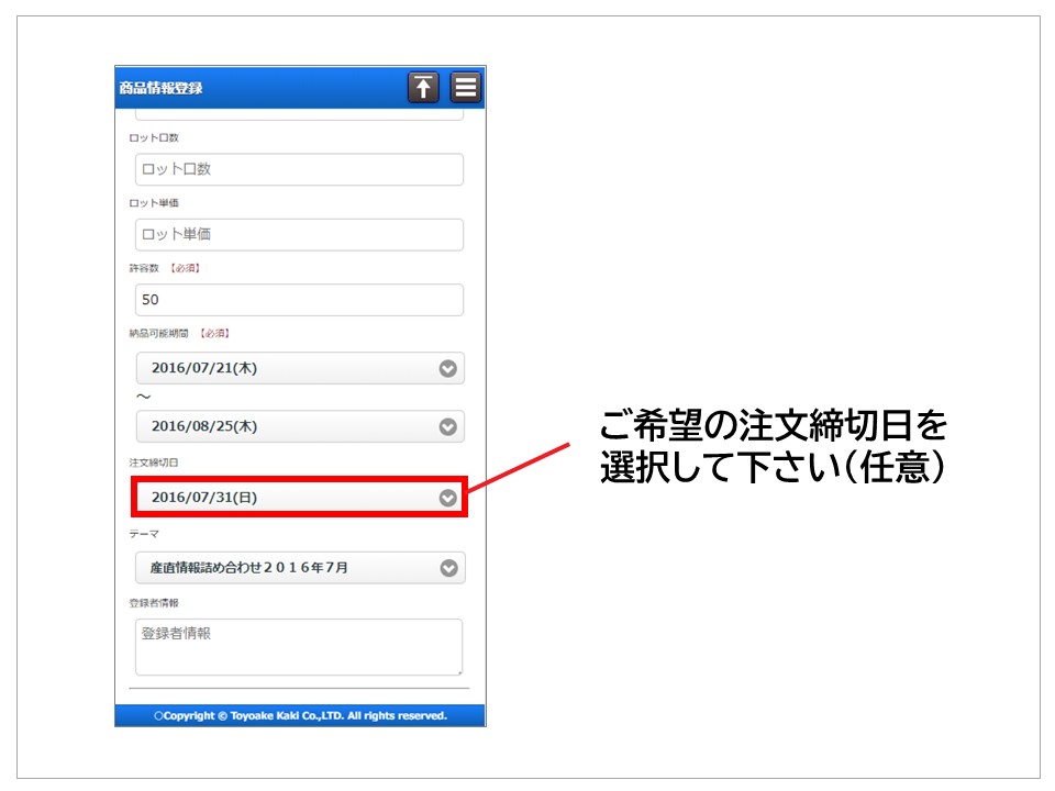 納品可能期間の下に「注文締切日」がありますので、ご希望の締切日を選択して下さい。