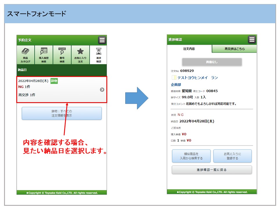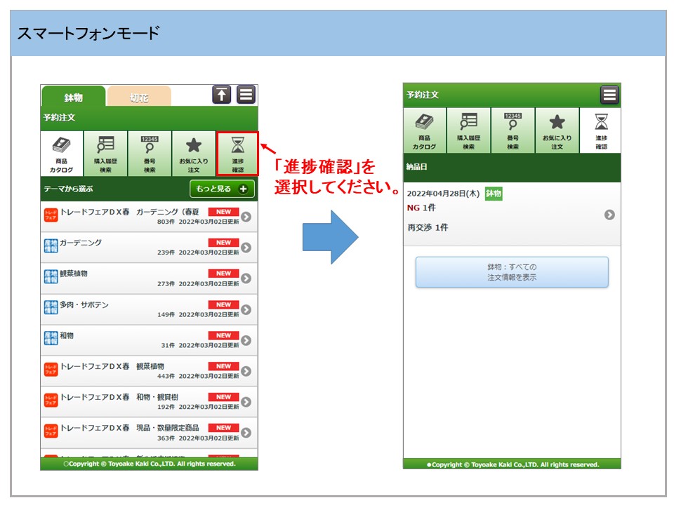 注文した商品は「進捗確認」から結果の確認が可能です。