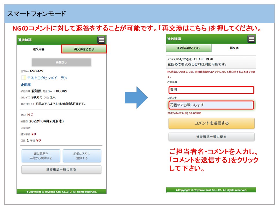 ④NGのコメントに対して返答をする場合、「再交渉はこちら」を選択してください。