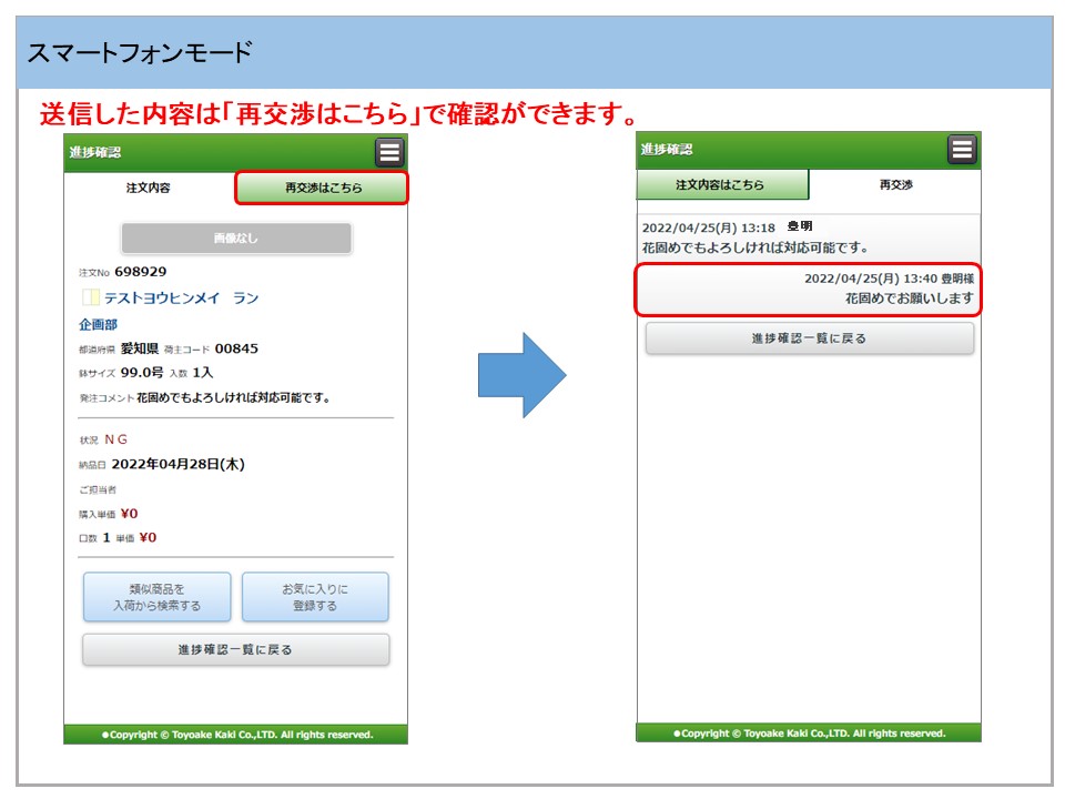 ⑥送信した内容は「再交渉はこちら」から確認ができます。