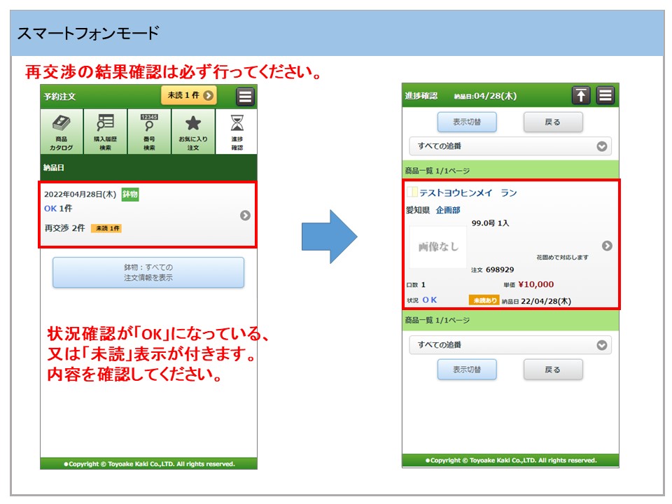 ⑦再交渉結果が返ってくると、OK表示または担当者からコメントがあれば「未読」の表示が付きます。